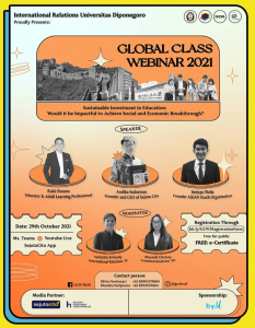 Mahasiswa Prodi Hubungan Internasional (HI) Universitas Diponegoro melalui International Relations Students Association (IRUD) sukses menyelenggarakan Global Class Webinar 2021 dengan tema “Sustainable Investment in Education: